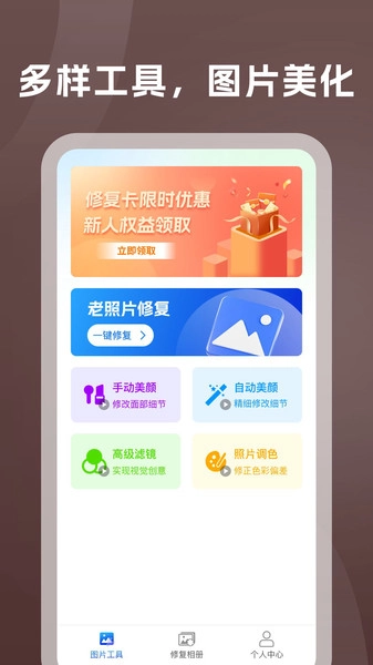 PS老照片修复是一款功能全面且操作高效的线上图片编辑美化平台,平台内在线特效素材十分丰富,同时它也是一款能实现一站式手机图片制作与编辑的软件。致力于打造全面高效的修图工具,可帮助用户快速完成图片美化与修图等操作,各类新颖的模板素材也都一应俱全。