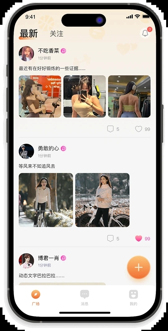 1、在广场页面中可以了解各类动态信息,你也可以点击“+”号发布各类动态;