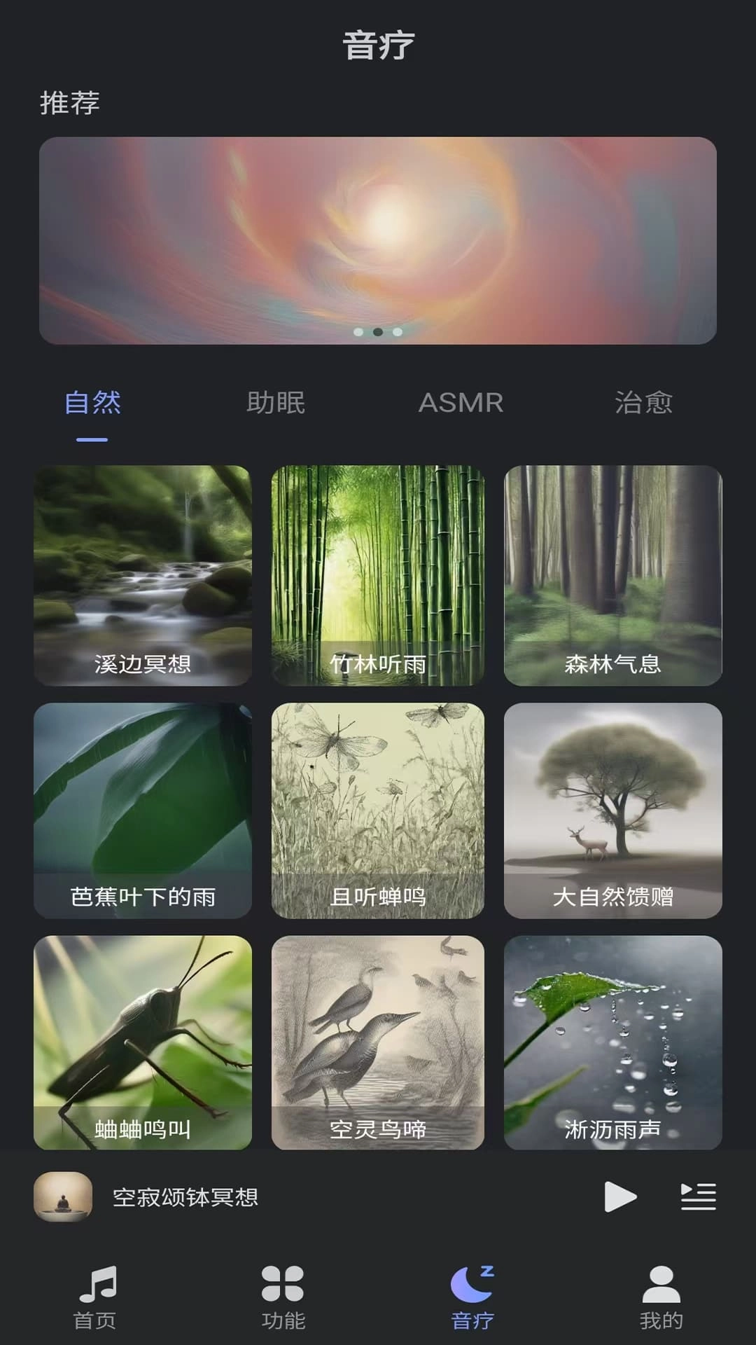 2、自然白噪音、ASMR、冥想音乐等丰富音疗内容,涵盖溪边冥想、竹林听雨等沉浸式音效。