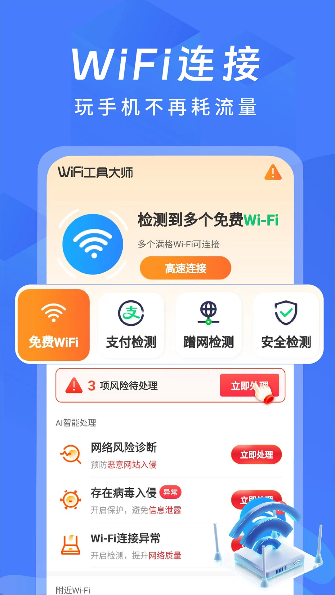 3、全面监测网络安全状况,保障用户所连接WiFi的安全性。提供实时网络测速功能,助力用户有效规避网络卡顿问题。