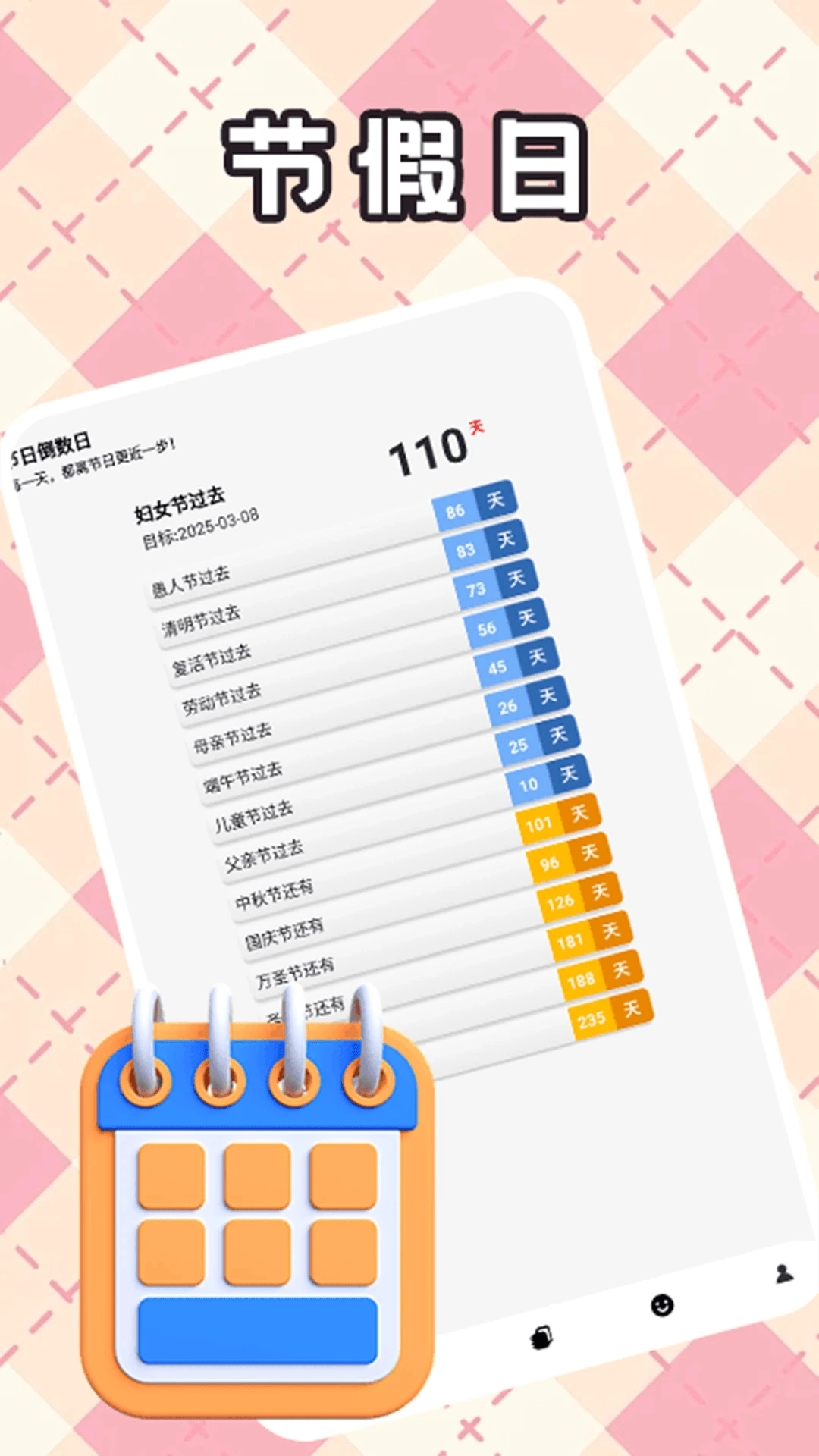 1、包裹着趣味外衣的实用工具:精准倒数日、节日倒数日、日记本以及今日心情记录。