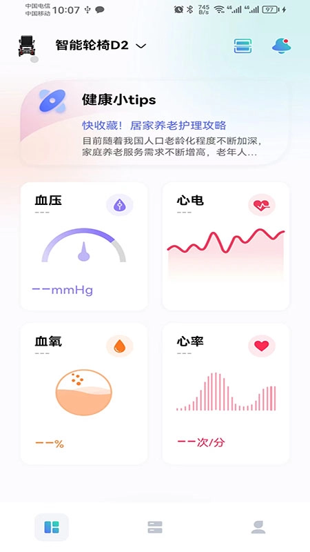 1、实时监测健康数据是否出现异常并同步给亲友,再结合远程轮椅控制功能,为用户的安全保驾护航。