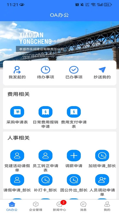 首页就能看到所有功能,像日常报销、费用申请、采购申请这些和费用相关的,人事板块则负责转正管理、请假补班这类事务,功能方面还是挺齐全的。
