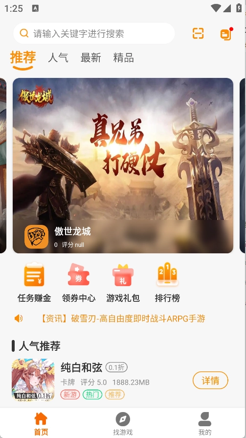 首页设有推荐、人气、最新、新品四大板块,其中推荐板块涵盖任务赚金、领券中心、游戏礼包、排行榜等内容。