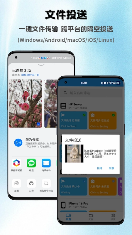 3、支持一键投送、整目录传输,文件可直接拖拽操作,手机端能借助分享功能实现快速发送。