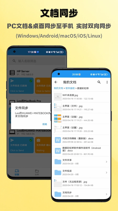 数据彩虹桥是一款专注于跨平台数据传输的手机应用,能帮助用户轻松完成手机与电脑等设备间的数据交互,有效解决不同设备、系统之间的数据传输障碍,提供安全便捷的文件传输、备份及同步服务,让用户无需依赖数据线,即可实现高效的无线数据管理。
