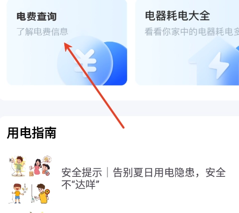 用户需先进入首页,找到“用电”板块,随后进行“电费查询”操作。