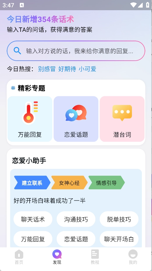 2、发现页面设有万能回复、恋爱话题、潜台词等版块,同时还包含各类恋爱小助手相关的信息内容。