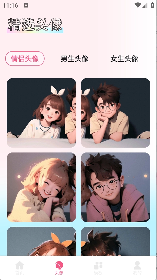 2、头像页面包含情侣头像、男生头像、女生头像等内容。