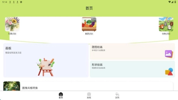 进入安装后的首页,能看到画板、跟图绘画、形状绘画等功能的展示。