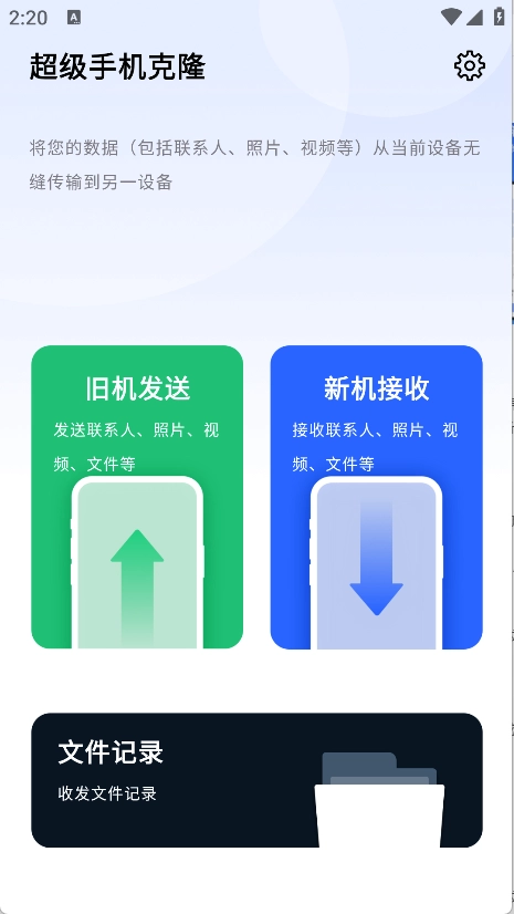 首页支持旧机发送、新机接收等操作,还能查询各类文件记录信息。