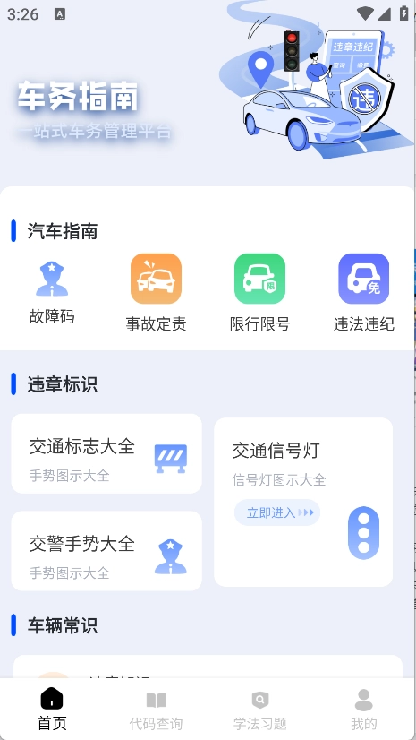 1、在首页能够了解汽车指南、违章标识以及车辆常识等相关功能。