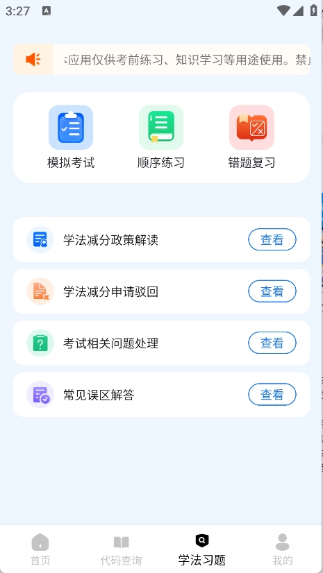 3、学法习题页面涵盖了模拟考试、顺序练习、错题复习这几个版块,同时还设有各类常见问答内容。