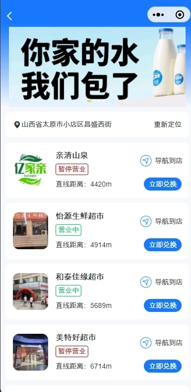 2、在超市页面中可以进行立即兑换,而且还可以重新定位进行了解超市信息。