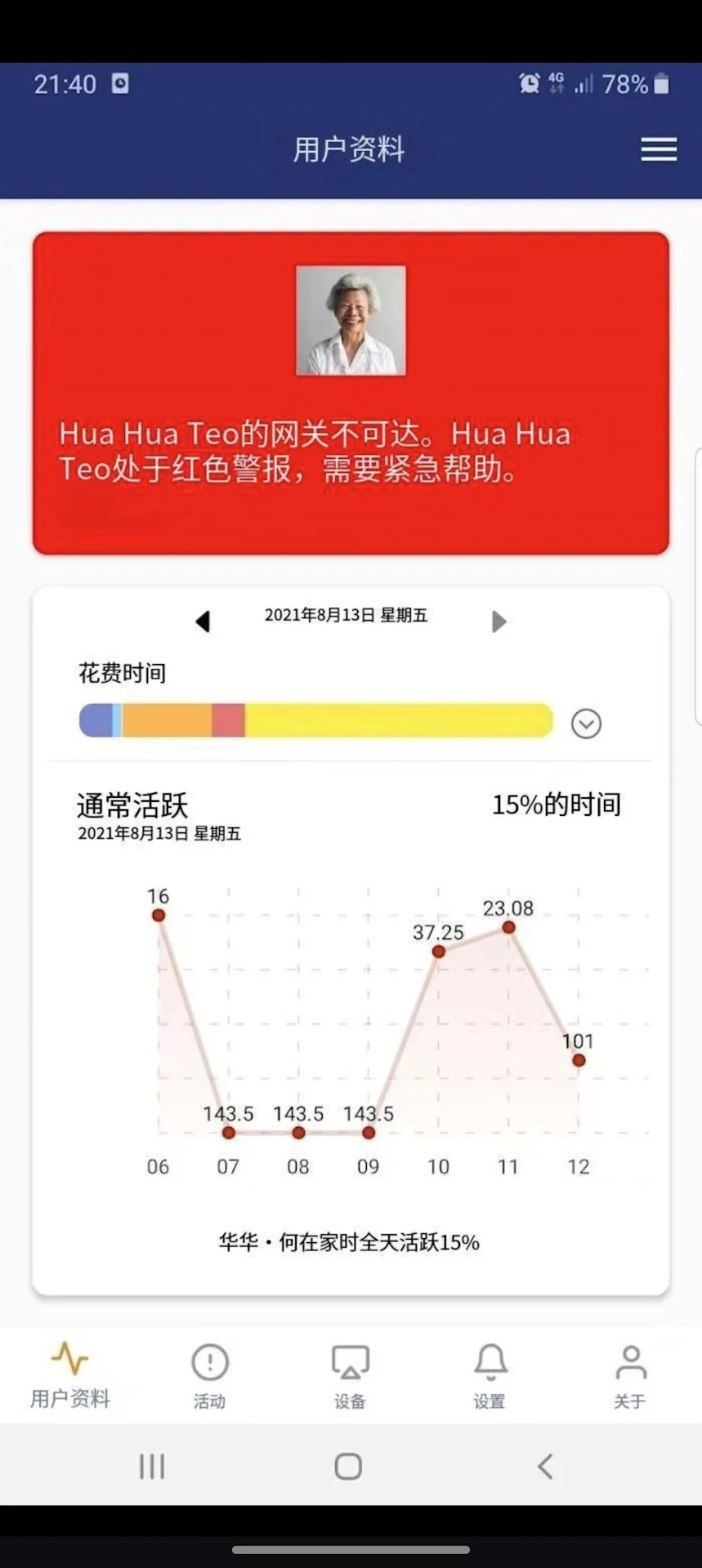 1、在用户资料页面能够了解老人的实际状况,并且可以实时查看活动图表;