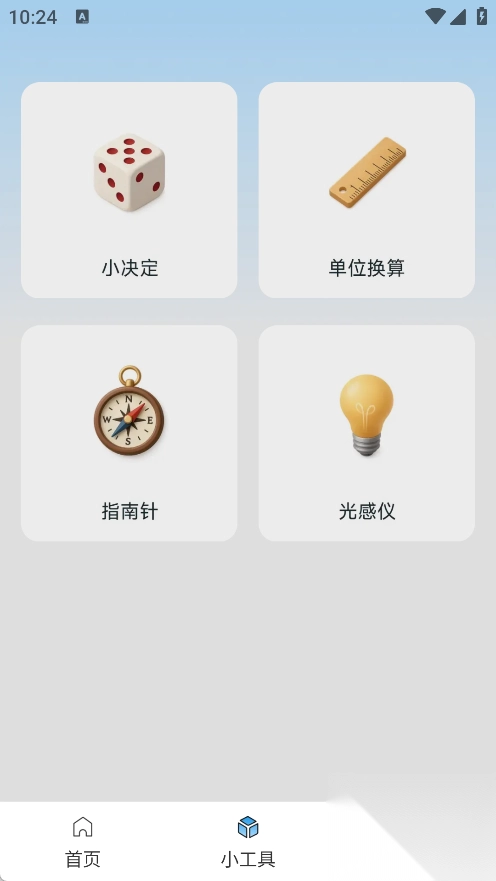 2、小工具板块整合了小决定、单位换算、指南针、光感仪等实用工具资源。