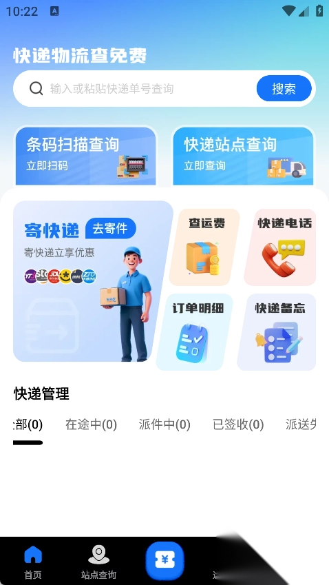 首页支持条码扫描查询、快递站点查询,以及寄快递、查运费等功能操作。