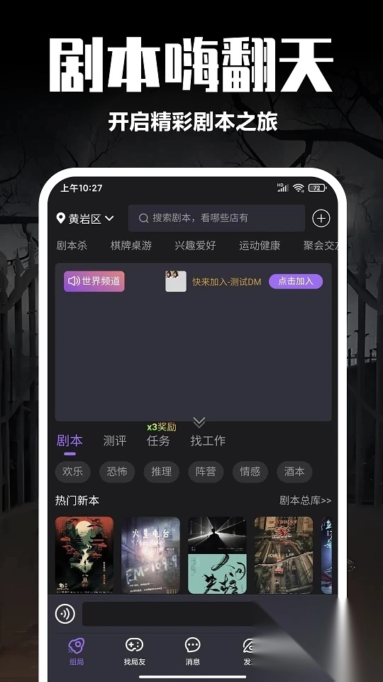 1、在组局页面里,你可以了解到各式各样的剧本,同时页面中还设有多种不同的版块。