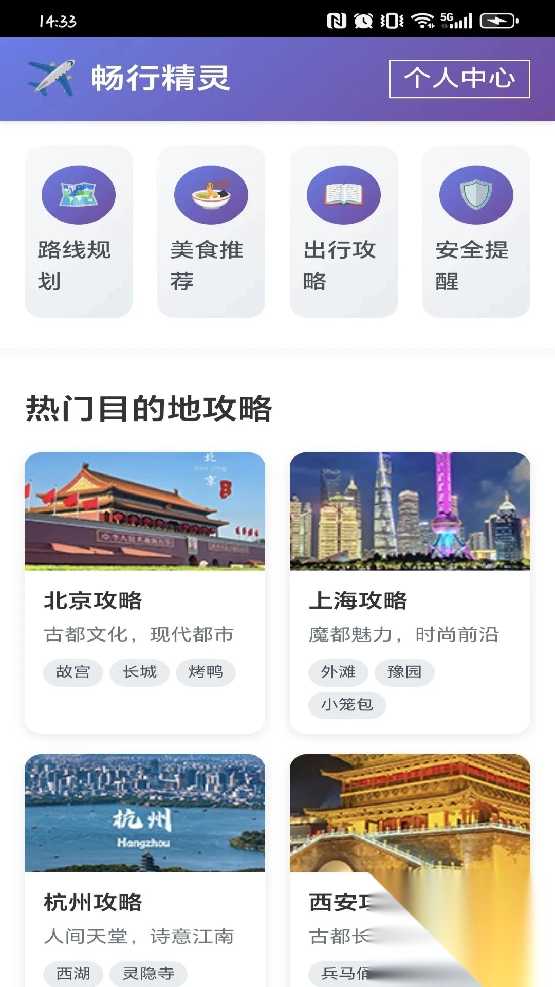 1、在首页就能看到路线规划、美食推荐、出行攻略、安全提醒,以及热门目的地的相关攻略;