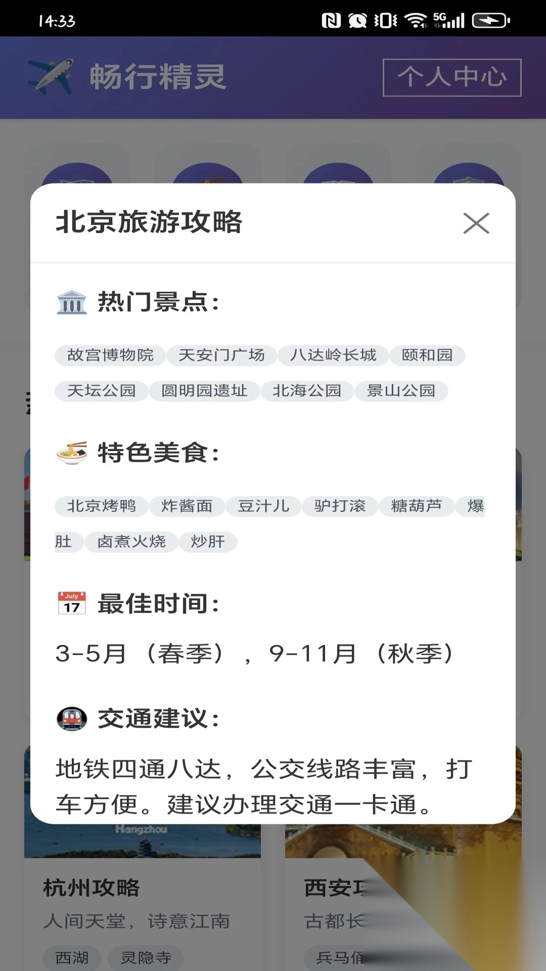 2、在北京旅游攻略页面里,能够了解到热门景点、特色美食、最佳旅游时间以及交通出行建议等相关内容。