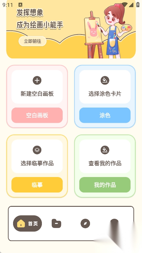 首页支持新建空白画板、进行涂色卡片操作,也能浏览各类临摹作品。