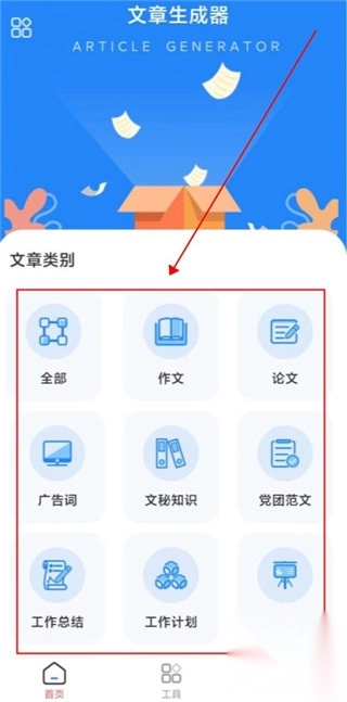 1. 开启主页面,从中挑选期望生成的文章类型。