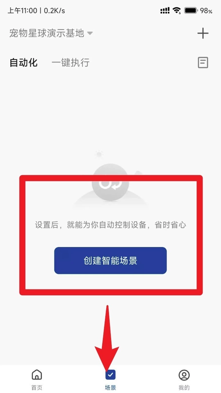 3. 点击底部的「场景」菜单选项,选择【创建智能场景】,用户可自行设定定时加水、夜间喂食等自动执行的任务。