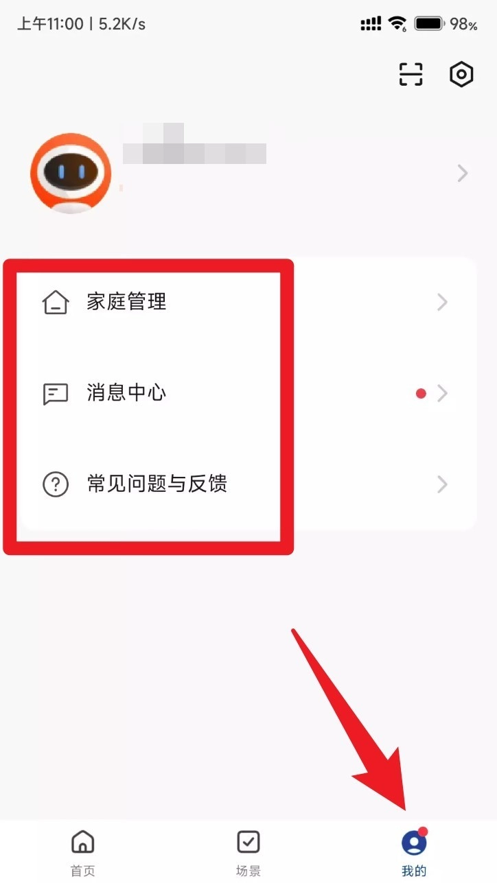4. 进入“我的”页面后,点击【家庭管理】选项,在此处能够添加家庭成员,还可以查看系统推送的消息以及常见问题的解答内容。