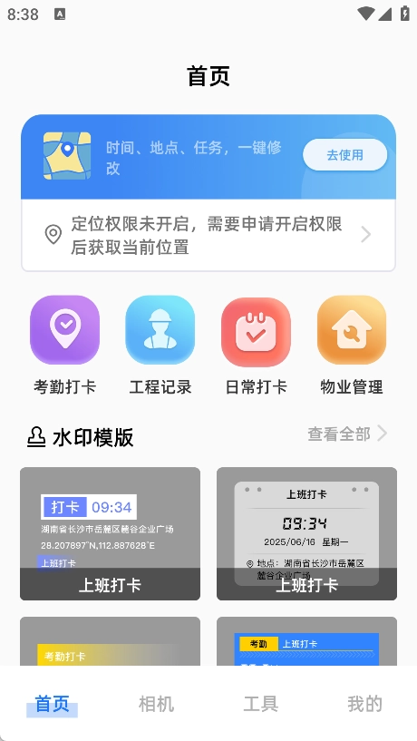 首页设有一键定位功能,支持考勤打卡、工作记录、日常打卡与物业管理操作,此外还配备了丰富的水印模板。