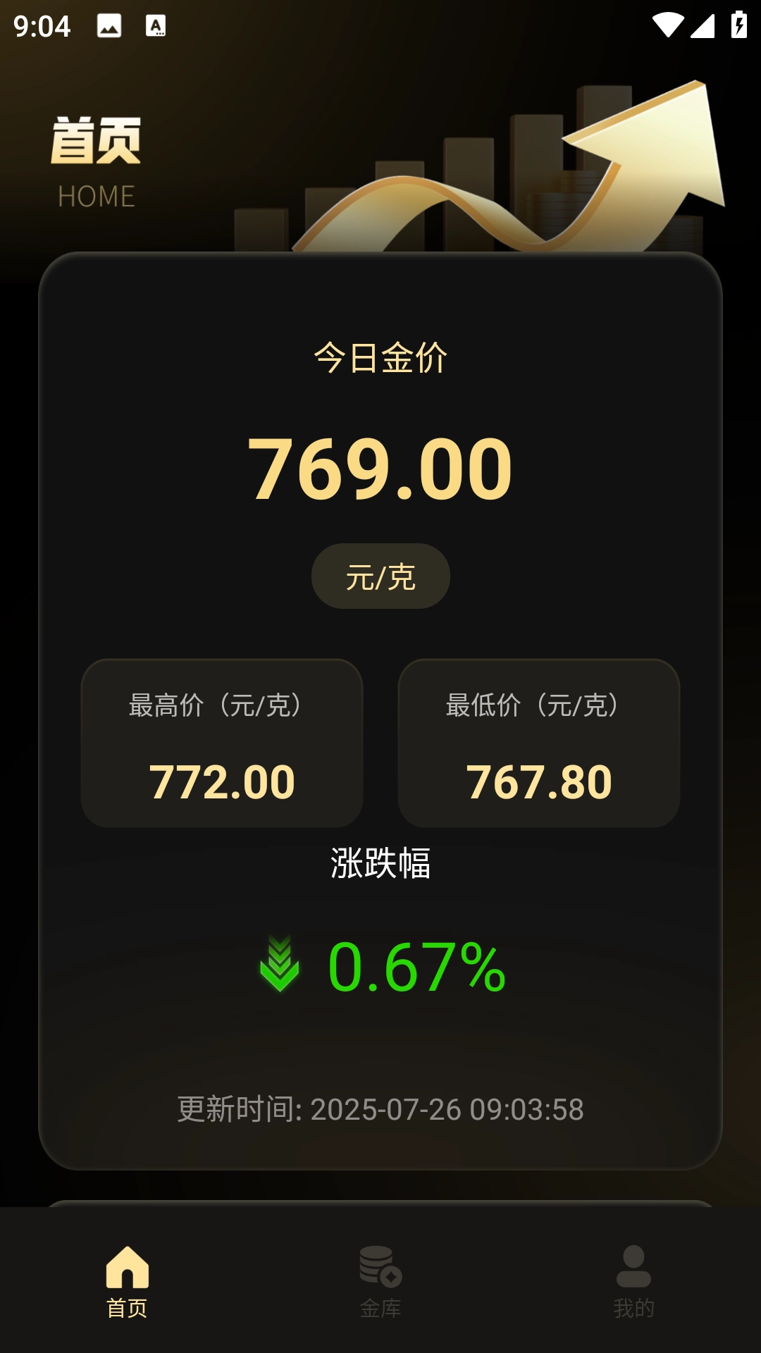 2、首页将展示最新的今日金价信息,其中涵盖最高价、最低价以及涨跌幅等内容。