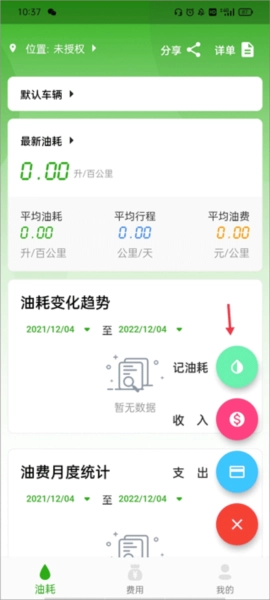 4. 能助力用户坚持节油环保理念,无论是上下班、高速行驶还是自驾游时的油耗和加油费用,都能快速记录。1. 在主界面的【油耗】区域,点击红色箭头指向的三横图标。