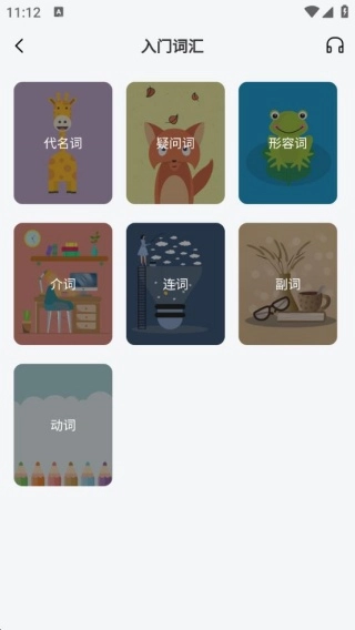 3、点击入门词汇板块,即可学习代名词、疑问词、形容词等各类词语,其发音均十分规范。