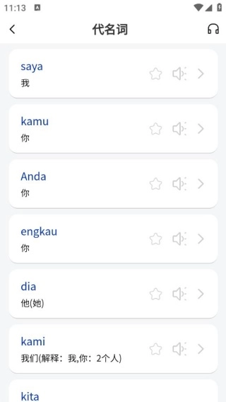 4、进入代名词学习界面后,戴上耳机,就能直接学习单词的发音了。