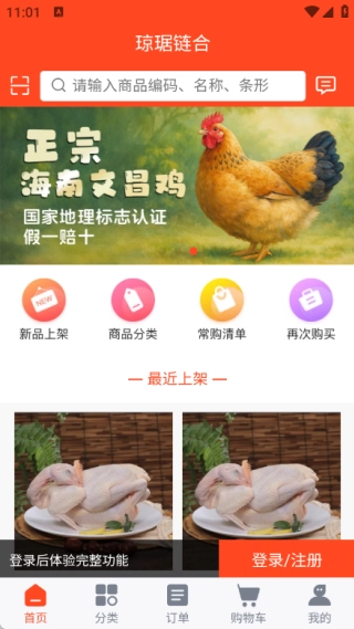 1、首页设有新品上架、商品分类、常购清单、再次购买等版块,方便用户了解最新上架的商品;