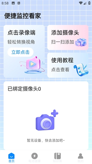 在首页能看到添加摄像头、使用教程等各类功能的入口;