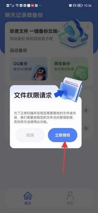 2、点击QQ备份选项,此步骤需授予文件访问权限,请点击“立即授权”按钮完成操作。