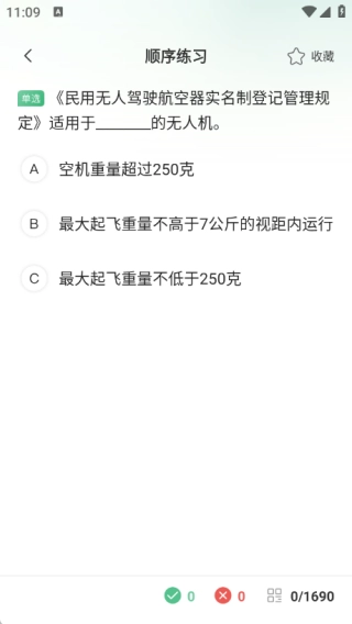 2、无人机刷题功能:支持个性化学习模式,能够依据知识点、题型、难度等维度进行分类练习,具备智能错题管理机制,可自动生成错题集,并提供与真实考试场景一致的模拟考试服务。