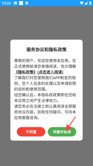 1、安装后,弹出服务协议和隐私政策,点击【同意并使用】按钮。