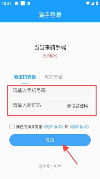 2、进入登录页面,选择【验证码登录】,填写手机号和验证码即可登录。