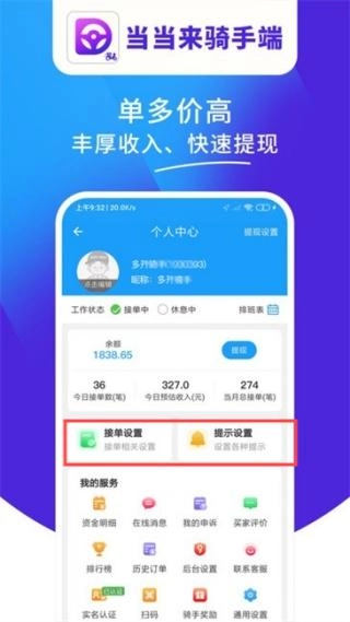 4、打开【个人中心】页面,进行接单、提示设置,或查看其他信息。