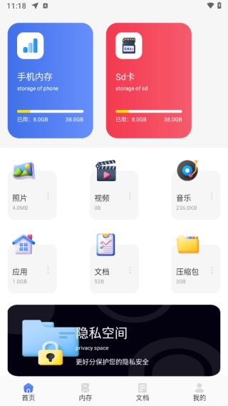 1、在首页能够浏览到全部功能,照片、视频、音乐、应用等各类资源都汇聚于此,可直接查看所有内容;另外还设有一个隐私空间,能用来存放私人隐私类资源。