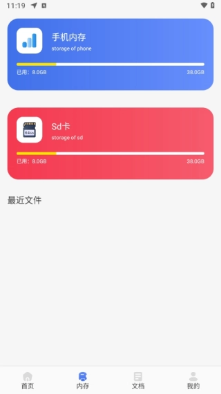 3、通过内存页面,你可以快速查看手机的存储设备信息,以及最近打开过的各类文件等内容!