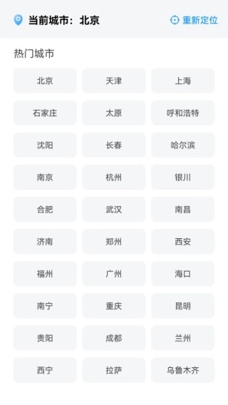 1、打开软件后,既能便捷地进行当前定位操作,也可以点击热门城市进行查看。