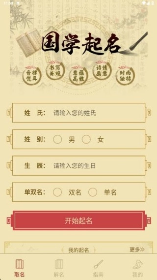 2、在取名页面提交姓氏、性别、生辰以及单双名偏好等信息后,即可快速完成取名操作。