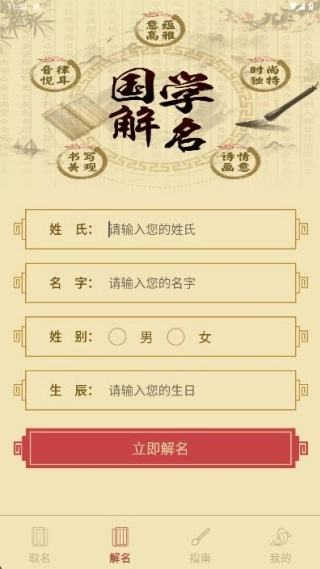 3、解名页面提供名字分析服务,助你了解个人名字蕴含的寓意。