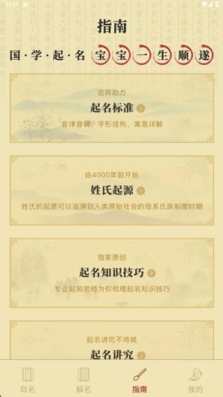 4、指南页面推送了起名标准、姓氏起源、起名知识技巧、起名讲究等各类信息,方便快速阅读。