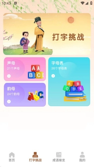 2、打字挑战提供声母、字母表、韵母等选项,学习打字可个性化开启。