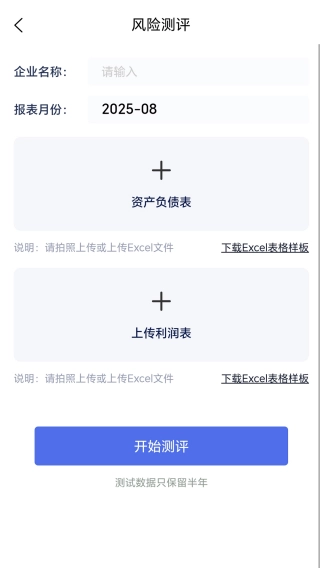 3、在风险测评界面,只需输入企业名称、选定报表月份,添加资产负债表并上传利润表,即可完成评测操作。
