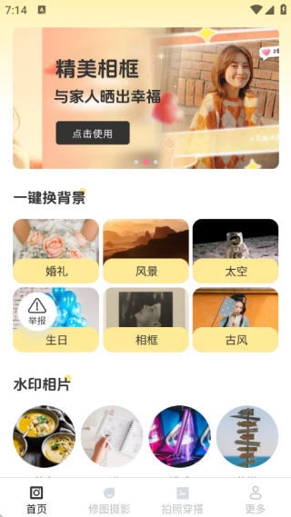 首页设有精美相框、一键换背景及水印相机功能,用户可随时体验使用。