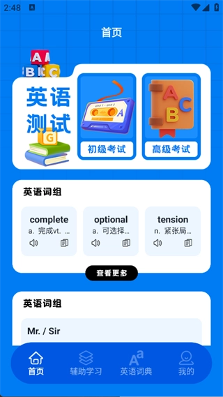 2. 在首页就能看到英语测试功能与英语词组功能,可依据自身进度来选择使用。